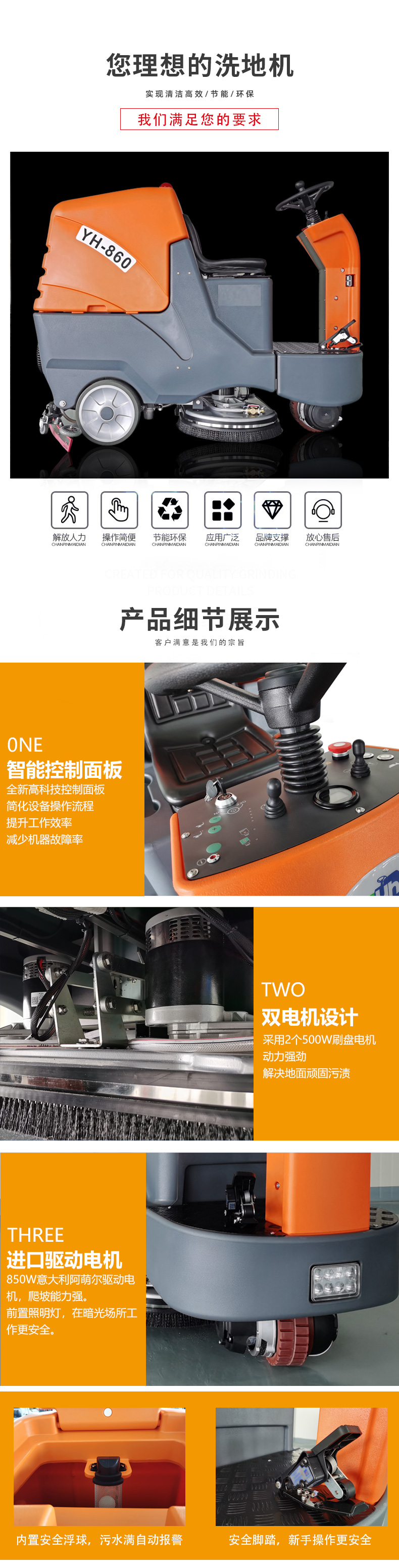 簡介:1、操作面板采用大型液晶顯示器,工作狀態實時顯示,一目了然 2、人性化自主設計,急停裝置,確保安全 3、采用前輪驅動設計,轉彎操控精準靈活